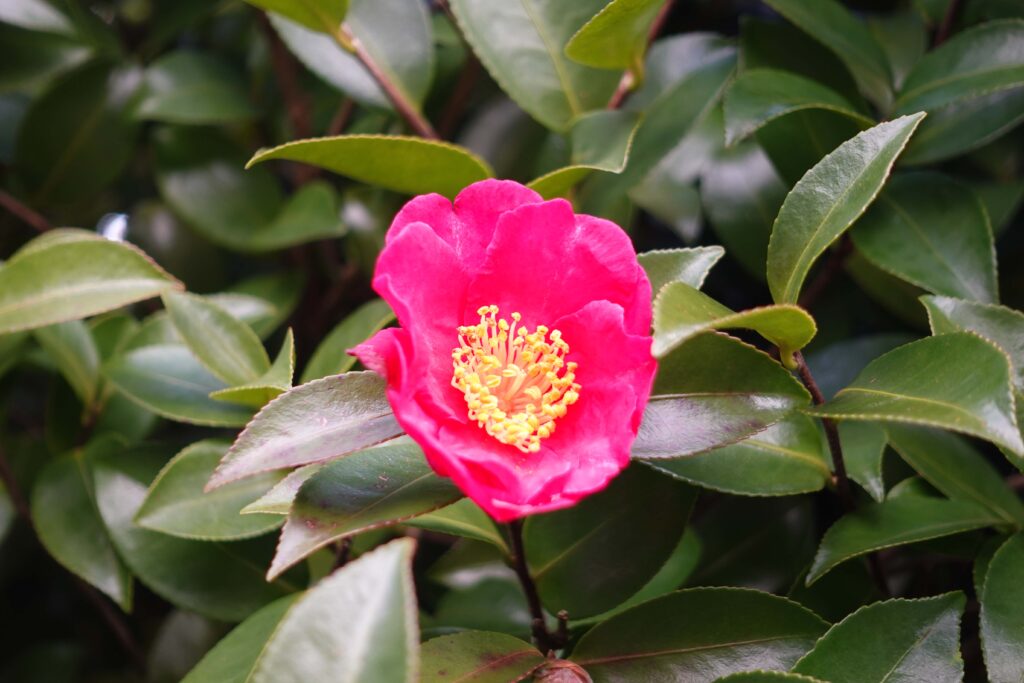 境内には、緑に映える鮮やかな椿が見頃です。