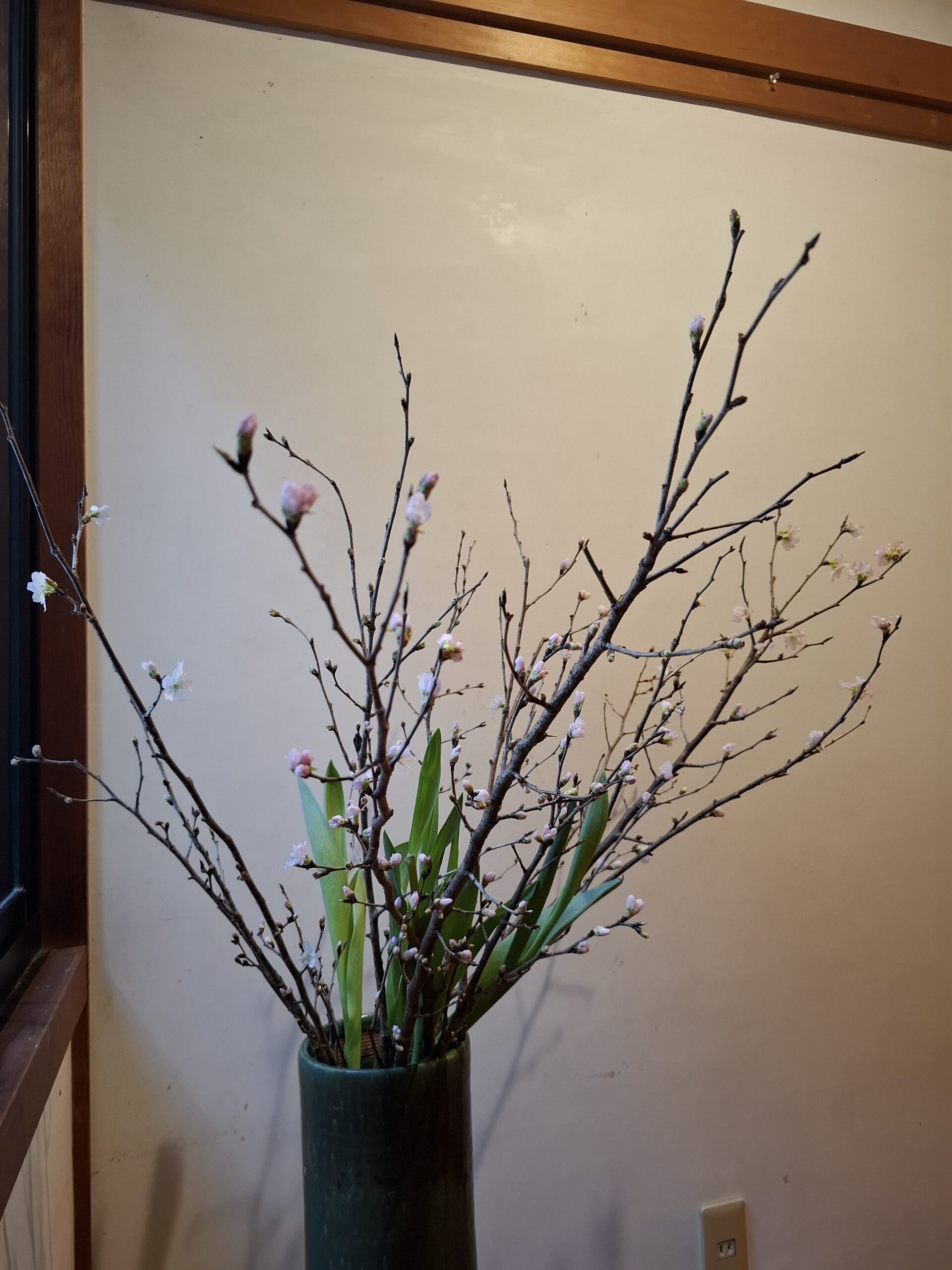 「スーパーで可愛らしい桜の枝を見つけたので、お寺さんに。」