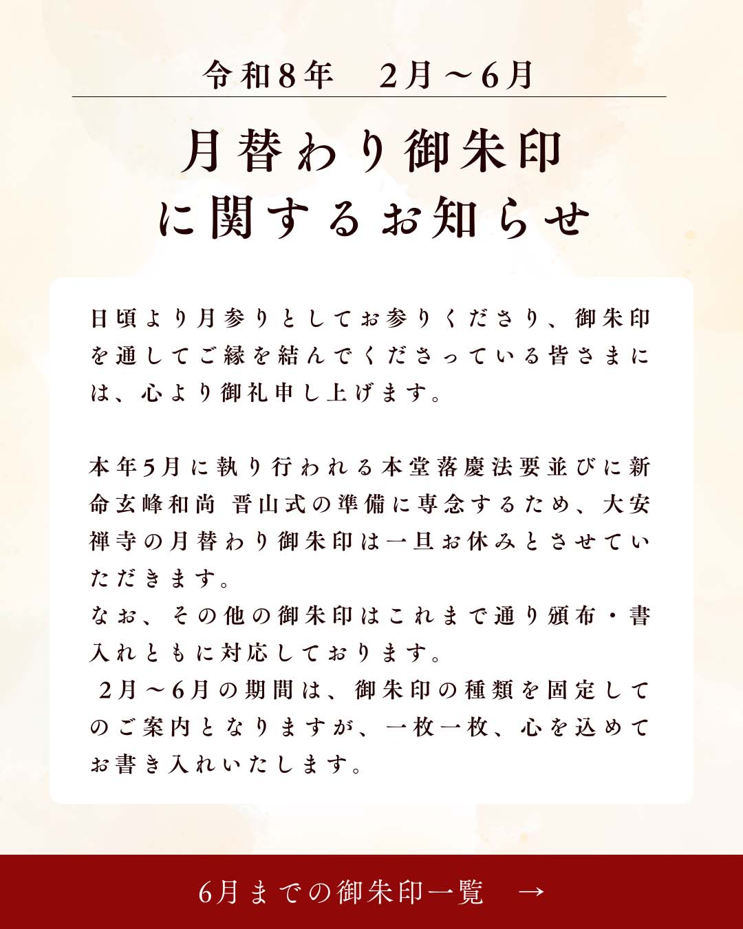 上記のご案内より、落慶法要並びに晋山式の準備に伴い、しばらくの間、月替わり御朱印をお休みとさせていただきます。