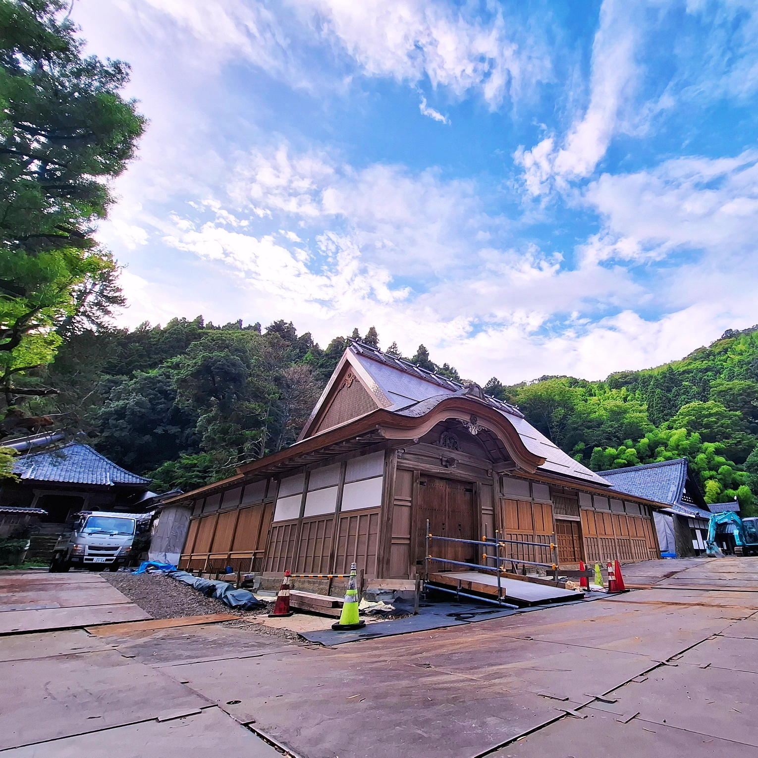 まず庫裏まわりでは、足場用の基壇の造成工事が着々と進められています。砂利と鉄板にて、しっかりとした基礎をつくる大切な工程。ここが安定してこそ、後の修理も安全に行えるのです。