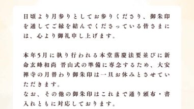 日頃より、御法縁賜り誠にありがとうございます。上記のご案内より、落慶法要並びに晋山式の準備に伴い、しばらくの間、月替わり御朱印をお休みとさせていただきます。また、その他御朱印に関しましては、変わらず頒布・お書入れさせていただきますので、ご来...