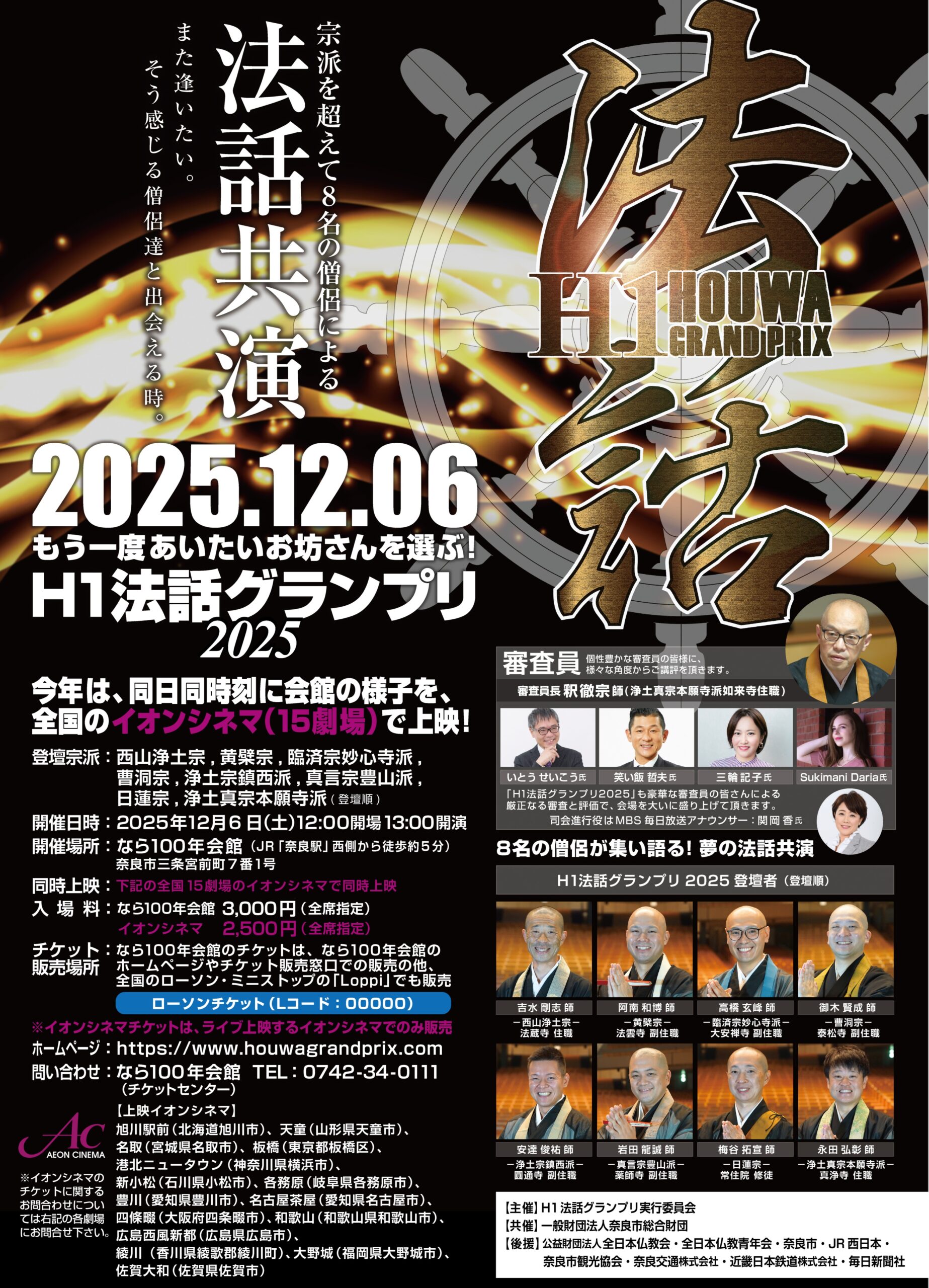 H1法話グランプリ2025出場!! 日誌 2025.10.07 ~副住職・髙橋玄峰、最終選考に残り登壇決定!~ 法話で出会い、心をつなぐ舞台へ このたび、大安禅寺 副住職・髙橋玄峰 が、全国の若手僧侶による法話競演 「H1法話グランプリ2025」 の最終選考に残り、登壇させていただくことが正式に決まりました。 ◾ 開催概要日時:令和7年12月6日(土) 開場 12:00 / 開演 13:00会場:なら100年会館 大ホール(奈良市)入場料:全席指定 3,000円(なら100年会館) 特記事項:当日は全国15か所のイオンシネマにてライブ中継も予定されています。 ◾ H1法話グランプリとはH1法話グランプリは、宗派を超えて若手僧侶が十数分の法話を披露し、「もう一度会いたい」と思われる法話者を来場者や審査員の投票で選ぶという大会です。 H1法話グランプリ2025僧侶たちが研鑽を積んだ法話を一堂に聞ける、仏教界でも注目の場となっております。私もこのような舞台に立たせていただけること、大変光栄に存じます。会場にお越しくださる方、ご覧くださる方のひとりひとりとのご縁が、私にとっても大切な糧になります。どうか皆さま、お時間ございましたらぜひお運びください。 大安禅寺 副住職 髙橋玄峰 合掌