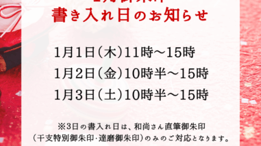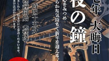 除夜の鐘■ 大晦日恒例 🕯 除夜の鐘12月31日(火) 大晦日23時45分頃より鐘つきを開始いたします(鐘楼)※午前1時半頃まで、どなたでも鐘をついていただけます。■新年 ご祈祷祭・法話🙏 ご祈祷祭0時20分頃より・招福祈願(枯木堂)引続き...